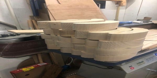Nadat de vorm uit de balk gezaagd is gebruiken we een bandschuurmachine om de ronde vorm van een banaan te evenaren. Dit doen we met grof schuurpapier.